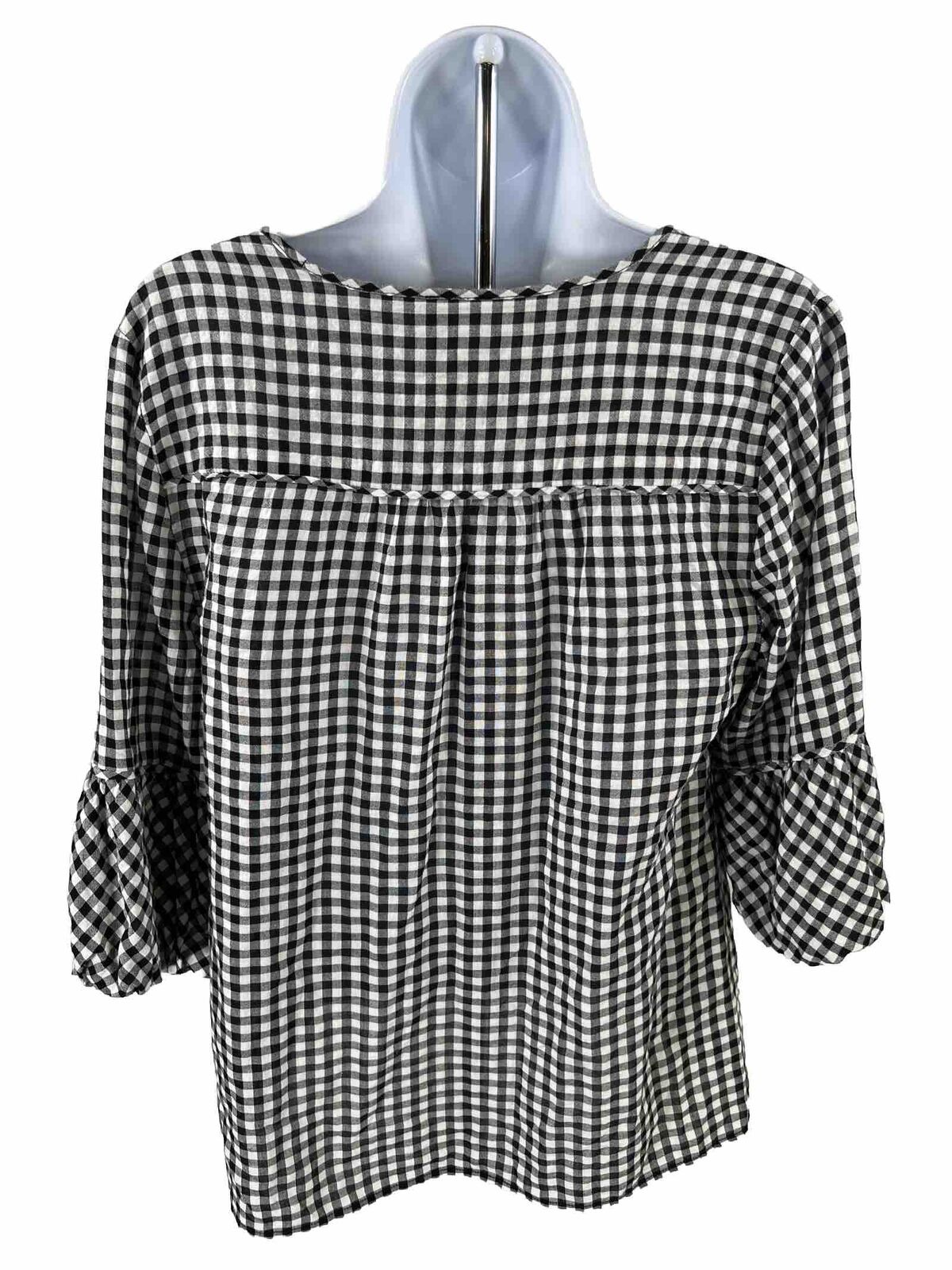 Chico's Women's White/Black Checkered 3/4 Sleeve V-Neck Top - 0/US S